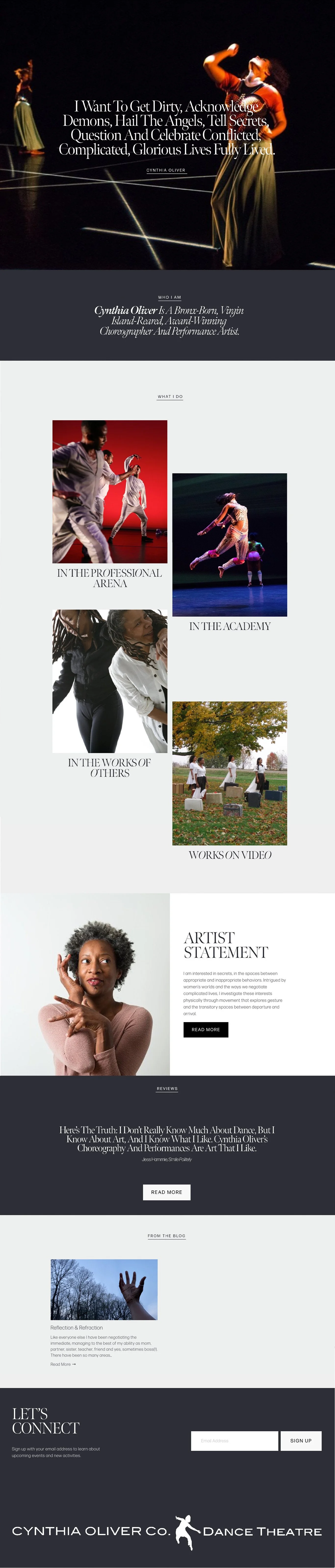 Cynthia Oliver is a dance maker, performer, and scholar. Together, we created a dynamic personal website that features her decades-long career in dance with bold typography and striking visuals.